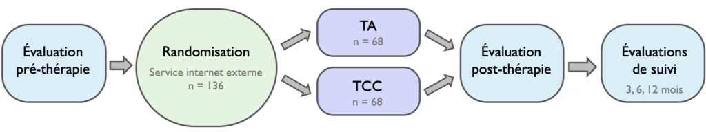 D’abord, les participants compléteront une évaluation clinique pré-thérapie d’une durée de 4h, qui se fait en deux temps. Ensuite, ils seront répartis de manière aléatoire à l’une ou l’autre des thérapies comparées. Un service internet externe complétera cette randomisation. La Thérapie Avatar, comme la TCC, se déroule sur 9 séances hebdomadaires d’une durée d’une heure. Par la suite, les participants compléteront une évaluation clinique post-thérapie de 4h, qui, comme l’évaluation pré-thérapie, se déroule en deux temps. À 3, 6, et 12 mois après la fin de leur thérapie, les participants compléteront une évaluation de suivi d’une durée 2h.